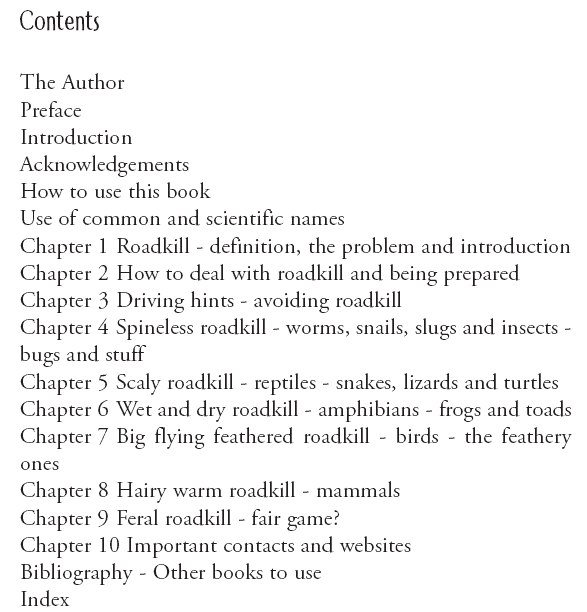 This book provides an overview of the types of roadkill, hints on what to do with them, how to clean bugs off the car and an eclectic mix of other information - from road safety to recipes.