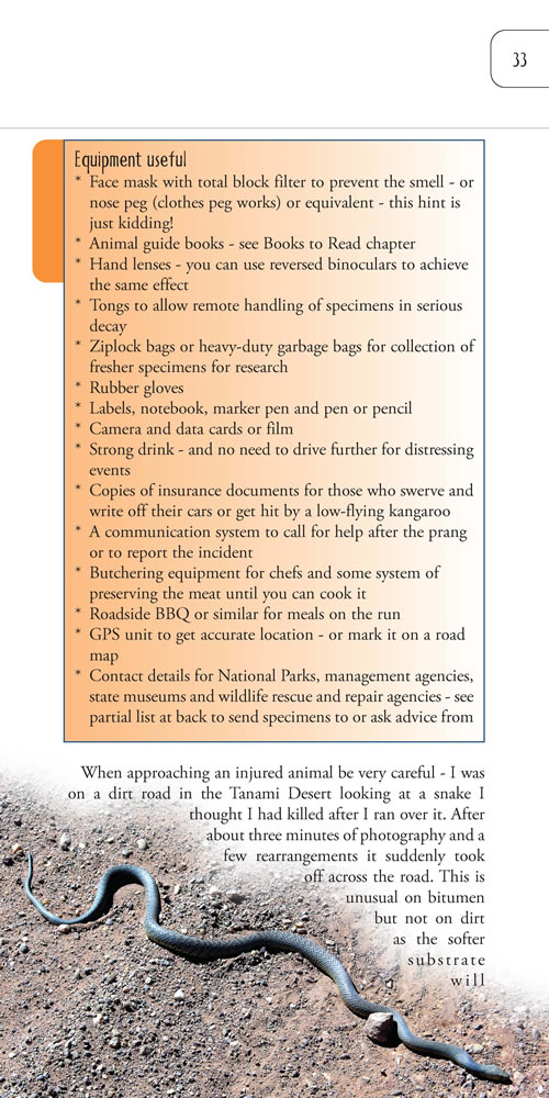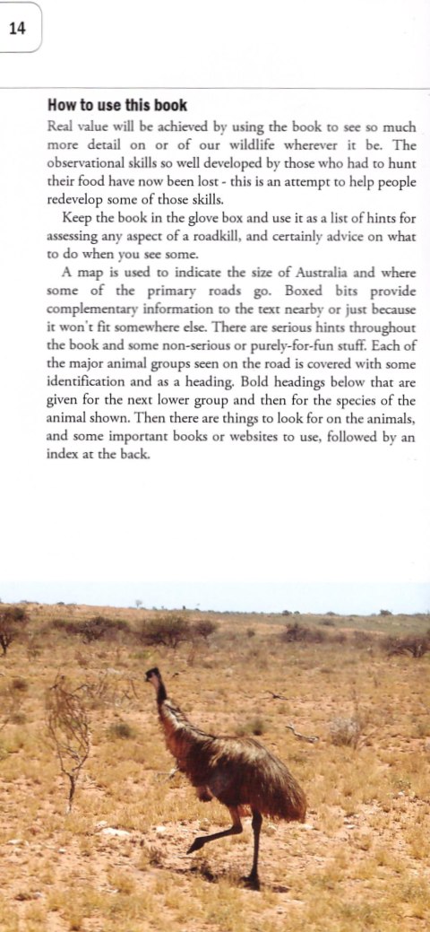 More than 200 photographs of roadkill, all allowing identification of the major animal groups and an excellent guide on how to avoid and observe roadkill and who to send interesting specimens or photographs to.